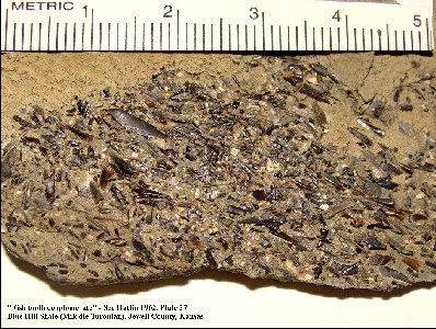 (Supplement to Number 3): 49A.(Abstract) (Picture 1) A diverse piscine fauna is reported for the first time from the Late Cretaceous Carlile Shale of Kansas. The relatively shallow (<100 m) marine assemblage derives from a thin (1-3 cm) fish-tooth conglomerate which lies 3-4 m below the top of the formation near Lovewell Reservoir in Jewell County, and accumulated during the late Middle Turonian regressive deposition in the Greenhorn Sequence. In contrast to larger material from transgressive lag faunas at the bases of sequences, the Lovewell fauna consists mostly of very small material (teeth, dermal denticles, vertebrae, and scales), suggesting winnowing by weak, intermittent currents. Due to size sorting for smaller particles, and the presence of a nearby nursery ground, teeth of juvenile individuals are unusually well represented. The fauna consists of 17 taxa (first records for Kansas are marked with an asterisk): 7 sharks (Ptychodus whipplei, *Chiloscyllium greeni, *Cantioscyllium d. decipiens, Otodus appendiculatus, Scapanorhynchus r. raphiodon, Squalicorax falcatus, and *Scyliorhinus sp.); 4 rays (*Rhinobatos incertus, *Ptychotrygon triangularis, *Ischyrhiza mira schneideri, and *Brachyrhizodus mcnultyi); and 6 bony fish (Hadrodus priscus, Pachyrhizodus minimus?, Xiphactinus a. audax, *a small unidentified albulid, Enchodus gladiolus and E. petrosus). As is found in many Late Cretaceous assemblages of marine shallow-water fishes, Scapanorhynchus is the most abundant shark and Enchodus petrosus is the most abundant of the bony fish. Both occur in far greater numbers than recorded in the younger, deeper water fauna of the Niobrara Chalk. Several elements of the fauna, however, do indicate a nearby deep-marine habitat (Ptychodus, Chiloscyllium, Otodus and Scyliorhinus). The rare albulid teeth may evince a small estuarine component, but neither freshwater nor terrestrial vertebrate remains are represented. This Kansas fish fauna closely resembles that from the Carlile of SW South Dakota, but less closely resembles that from the Carlile of NE South Dakota. The Lovewell fauna suggests a relatively shallow marine environment located far from the eastern shore of the Western Interior Sea. LEFT: A small fragment of the "Fish Tooth Conglomerate" of Hattin (1962), rediscovered in 2002 by Mike and Pam Everhart. |