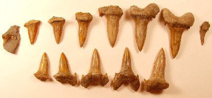 Sharks have lived in the oceans that once covered Kansas for almost as long as there have been sharks. While most of the shark teeth and other shark remains shown on this page are from the Cretaceous Period of the Mesozoic, the Paleozoic shark teeth shown at the bottom include examples of some of the first vertebrate remains described from Kansas by Joseph Leidy in 1859. The ages of the shark teeth shown on the page progress from the youngest (Late Cretaceous) shark remains to the oldest (Lower Permian) as you go downward.