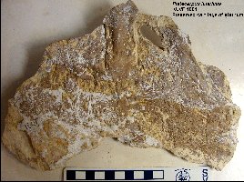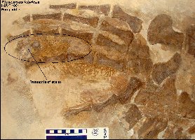 RIGHT: A view of the neck region of KUVP 1001, showing the preserved cartilage rings of the trachea above the cervical vertebrae. The area in the oval apparently came off during preparation and is mounted with the specimen...note that it is a mirror image (counter-part) of the area shown below, and includes several of the cervical ribs. |