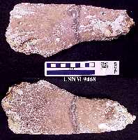 LEFT: One of the two polycotylid propodials (USNM 9468) recovered from inside the rib cage of a Tylosaurus proriger from the chalk of Logan County, Kansas (either a humerus or femur) by Charles Sternberg and sons. Note partially digested appearance. See Everhart, M. J. 2003.