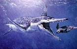 A nothosaur (early to late Triassic) prowls the shallow sea for food. These semi-marine lizards reached lengths of about 3 meters. Their remains are found in many places around the world, including China, Russia, Germany, the Netherlands and North Africa. Instead of paddles, Nothosaurs had webs between their long toes. See a picture of the cast of small Nothosaur skeleton here. |