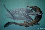 lucasi attacks an early mosasaur. Although pliosaurs became extinct during Turonian time, they were still