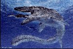 This picture shows an attack by a very large (30'+) mosasaur called Tylosaurus proriger on a much smaller Platecarpus mosasaur. Tylosaurus occasionally killed and ate other species of mosasaurs but there is no evidence to show that any of the mosasaurs were cannibalistic toward their own species. (My apologies for the poor color in this photo... This is what it should look like) |