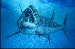 The Cretaceous Seas were a dangerous place for lots of good reasons. This view shows two giant (up to 17 feet or more in length) Xiphactinus audax on the prowl for their next meal. These fish fed by swallowing their prey whole, and are sometimes found with their last meal perfectly preserved inside. |