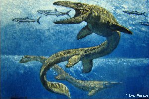 This picture shows a Plioplatecarpus feeding on a school of bone fish and is based on a specimen found in Central Alabama by a Historical Geology class from Okaloosa Walton Community College in Northwest Florida. Plioplatecarpus mosasaurs were more advanced and somewhat specialized. See the latest Plioplatecarpus page - A Plioplatecarpus from North Dakota |